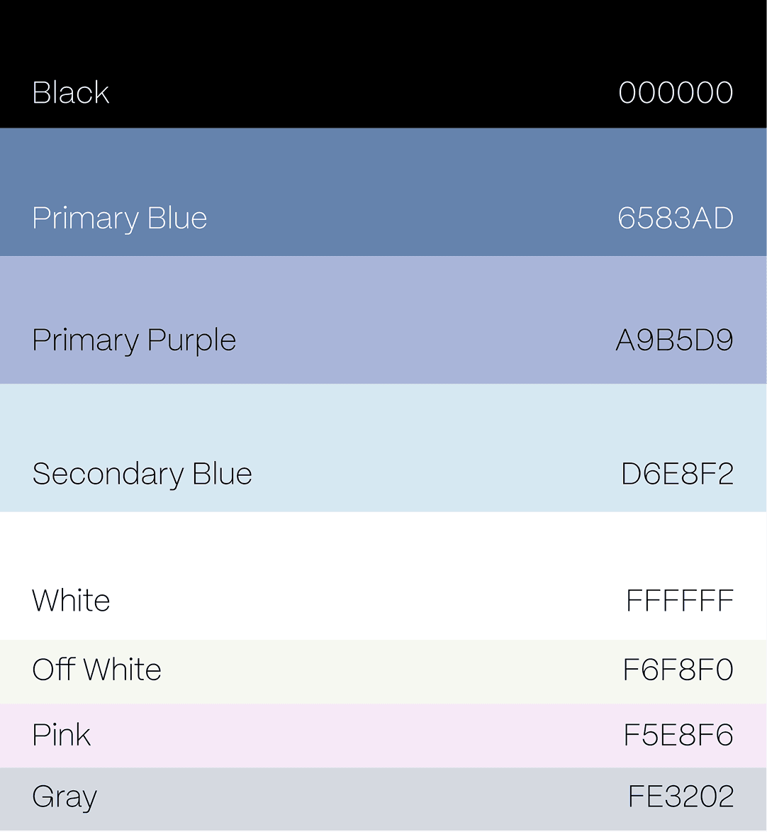 I defined a restrained color palette derived from the initial moodboard. Cool blues and purples convey technical depth and stability. Lighter accents reflect the founders’ preference for optimism and approachability.
