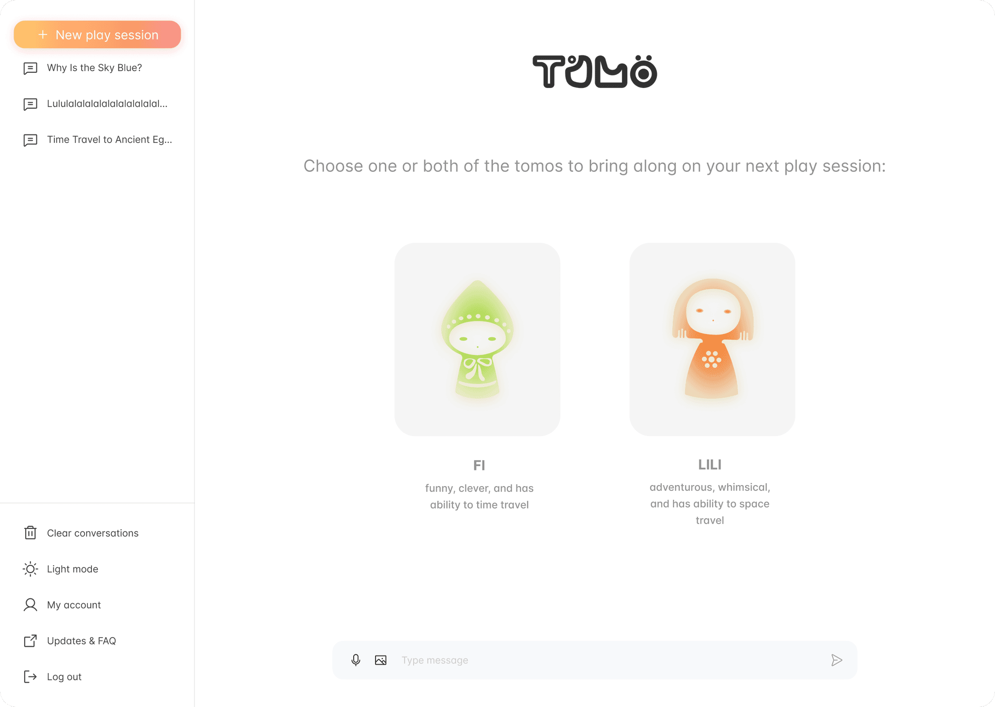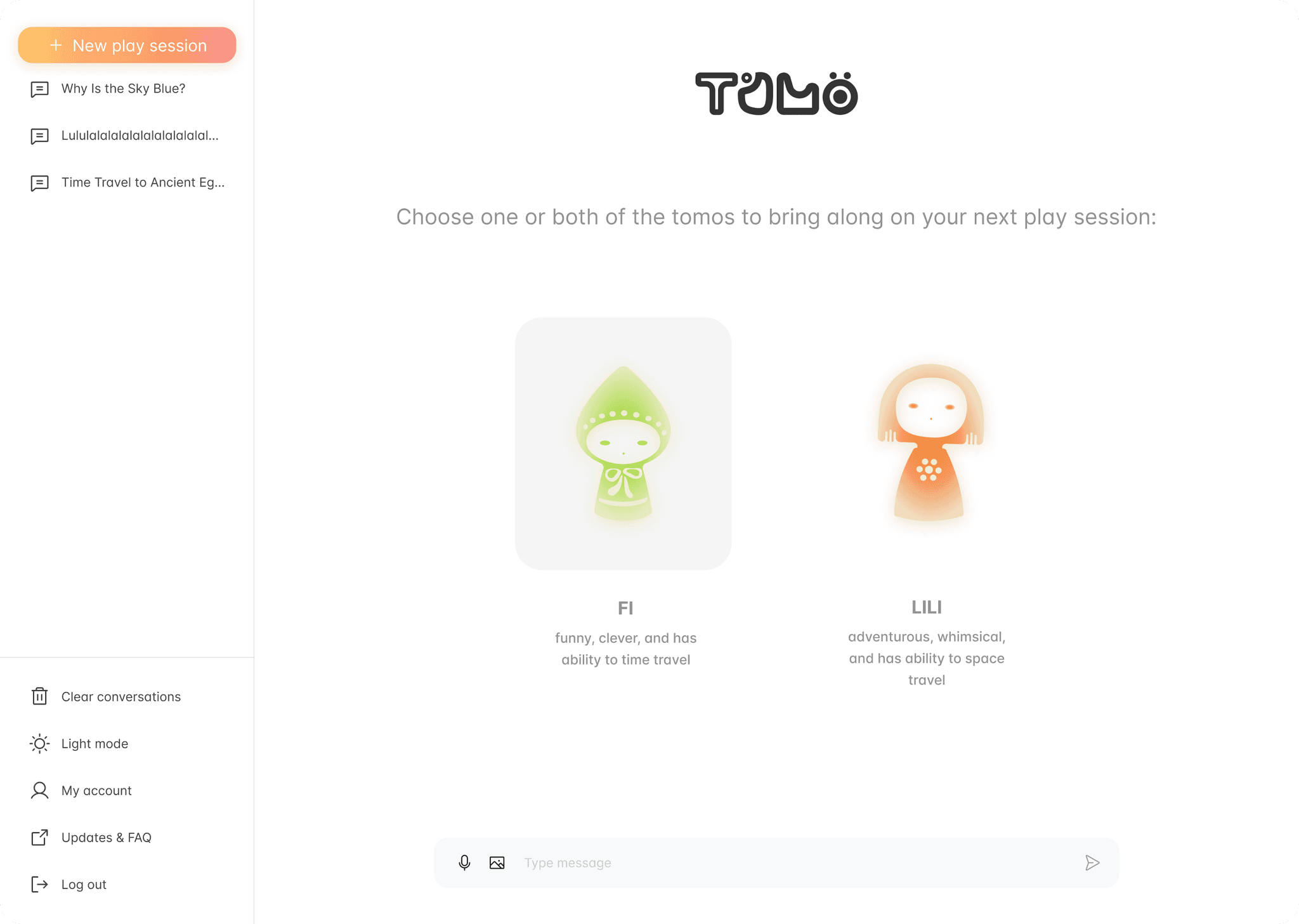 I designed a basic chat interface on the web for character selection and customizing conversations. In the future, I hope to implement a portal for parents to learn about their child and safeguard the usage of Tomo.
